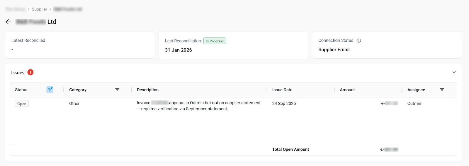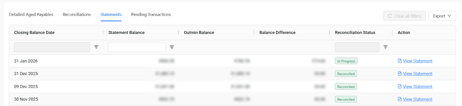 The Statements tab is worth highlighting. For each period, you see the supplier's closing balance side by side with what Outmin has in the ledger. If there's a difference, it's right there. If the reconciliation is in progress, you can see that, too.